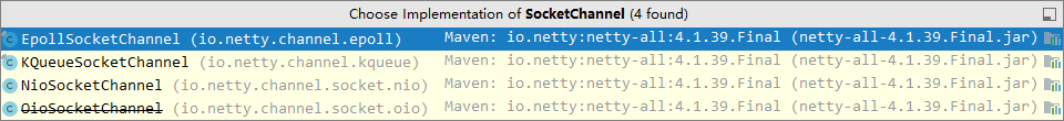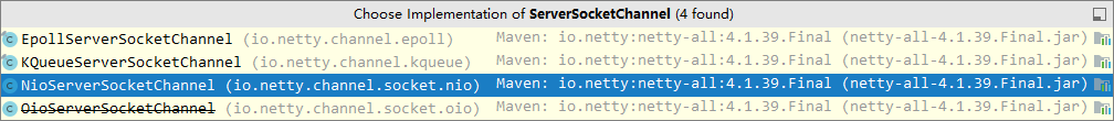 线程池 + Selector2 处,选择服务 Scoket 实现类,其中 NioServerSocketChannel 表示基于 NIO 的服务器端实现,其它实现还有