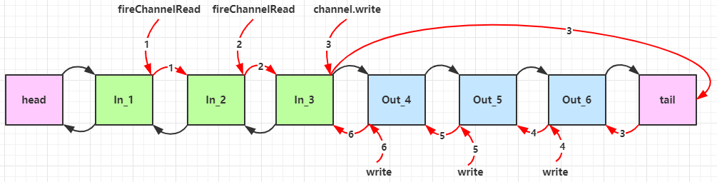 数据经过网络传输,到达服务器端,服务器端 5 和 6 处的 handler 先后被触发,走完一个流程