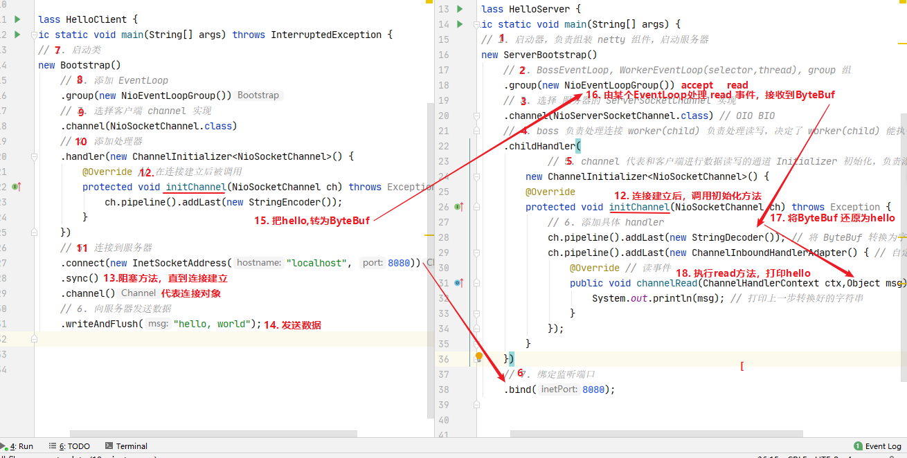 8 处,消息会经过通道 handler 处理,这里是将 String => ByteBuf 发出